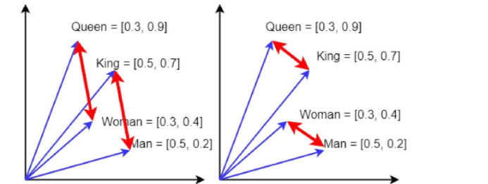 In embedding space, words with similar meanings point in similar directions—even if their vector lengths differ.